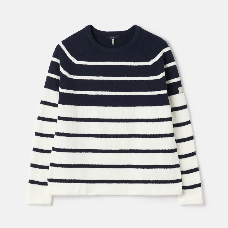 Our Seaport jumper has become a favourite for many, especially during the colder months of the year. It’s crafted from a chenille fabric which gives it that fuzzy effect that’s soft against the skin. The tubular neckline and raglan sleeves makes it easy to layer up too. This season’s edition is adorned in classic navy stripes against a fresh creme background. It’s finished with side splits and Joules branding to the hem and left sleeve (as worn).