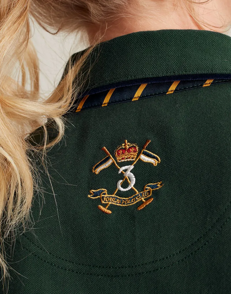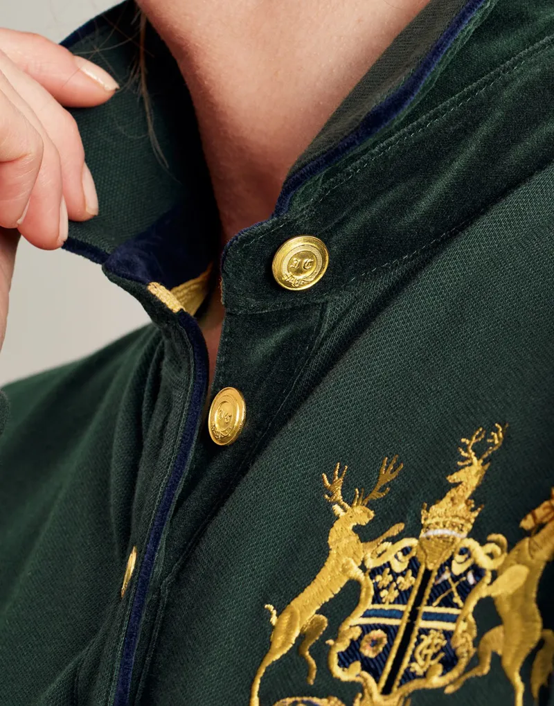 Combining a traditional polo style with a feminine shape, the Ashley is a must for your wardrobe. It has a slim fit that hugs the body and is made from soft cotton pique with added stretch. Elevating it beyond a ‘basic’ polo is the plush velvet undercollar and trim as well as the gold metal buttons. An intricate Joules polo club badge has been embroidered to the chest along with embroidered polo mallets and the player number 3 embroidery to the outer back neck.