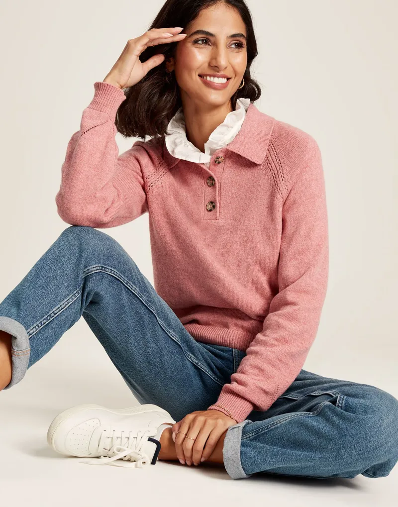 Layer up with this wonderfully relaxed jumper, designed for adding a touch of cosy style to your outfit when the British weather comes blowing in. It has raglan blouson sleeves for a slouchy silhouette, with a preppy collar and button front, along with pretty pointelle details that make this jumper extra special.