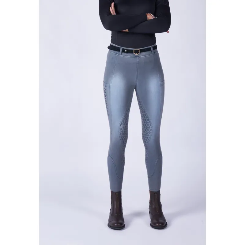 Available in 3 Denim shades these tights give you all the practicality of a riding tight with a chic high street style Extremely comfortable and super stretchy for those equestrian tasks whilst looking on trend High elasticated waist with belt loops for extra support a pocket on each leg and a full silicon seat finished in a beautiful stone washed denim.