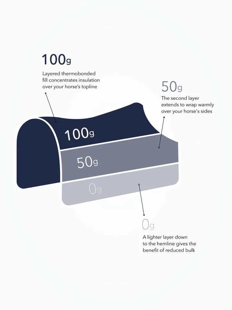 100g thermobonded fill is cleverly quilted to concentrate fill density over your horse’s topline, protecting the major shoulder, back and hind quarter muscle groups with cosy warmth. A double layer of fill extends further, to wrap over the horse’s sides, while a single layer down to the hemline gives the benefit of reduced bulk.