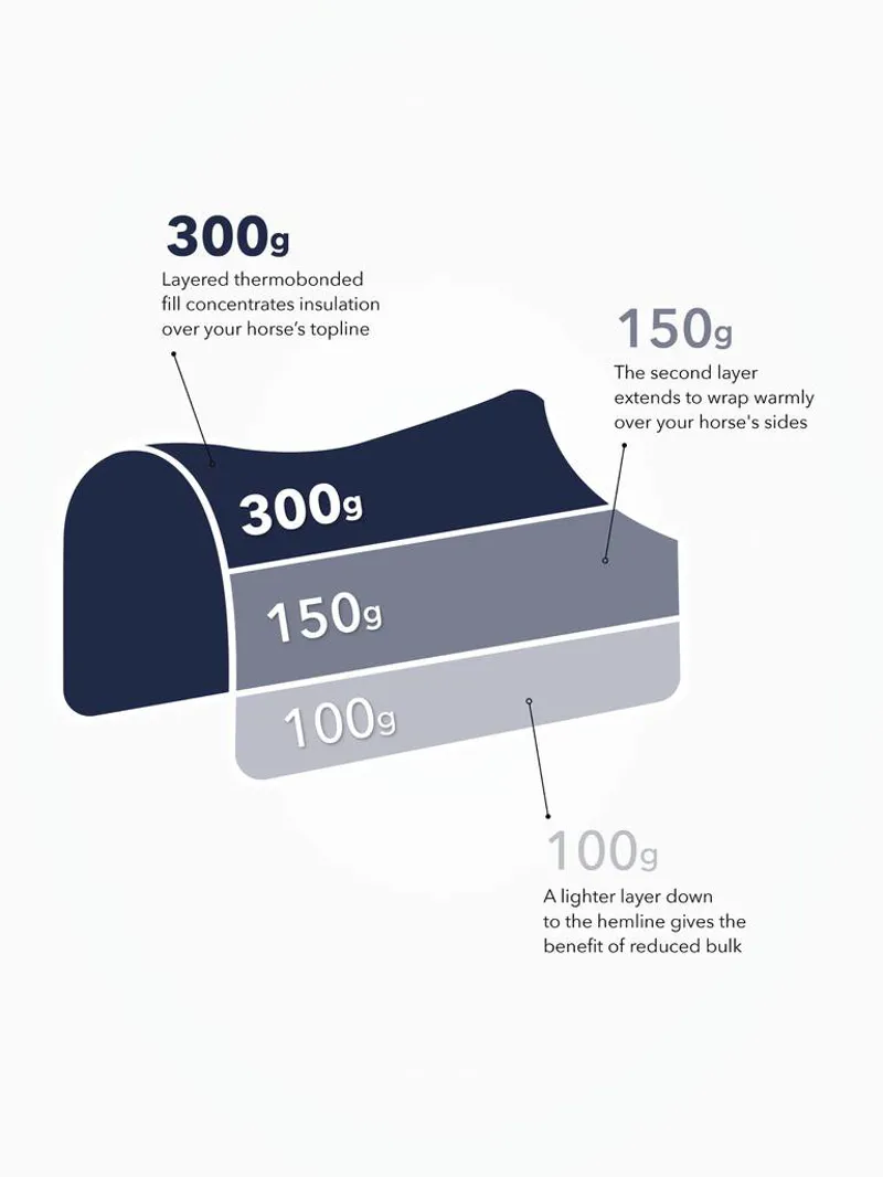 300g thermobonded fill is cleverly quilted to concentrate fill density over your horse’s topline, protecting the major shoulder, back and hind quarter muscle groups with cosy warmth. A double layer of fill extends further, to wrap over the horse’s sides, while a single layer down to the hemline gives the benefit of reduced bulk.