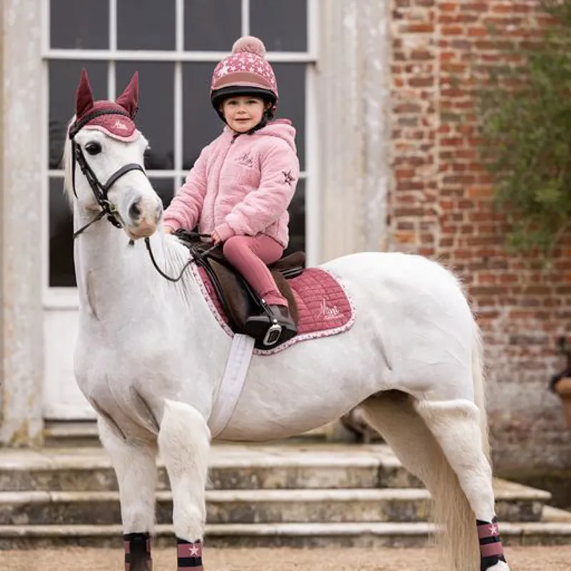 At last a premium designer collection for Kids! Mini LeMieux is intended to appeal to the under twelves with an eye for style. Sharing all the same technical spec as the main LeMieux saddle pads with 100% Natural Bamboo linings, high wither, strengthened girth protection areas and girth strap locking loops. These beautiful pads are made with a luxury suede top side and fun star design binding unique to the range. The Mini LeMieux collection is completed with small matching brushing boots and hand crocheted fly hood all designed particularly for 11.2hh to 13hh ponies.