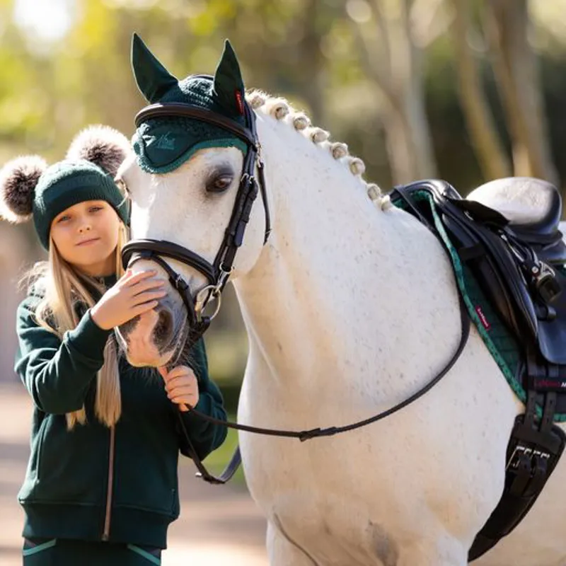 At last a premium designer collection for Kids! Mini LeMieux is intended to appeal to the under twelves with an eye for style. Designed particularly for 11.2hh to 13hh ponies, the Mini LeMieux Fly Hood is hand made from two styles of close-knit crochet with comfortable high-density fabric ears that soften sound. Suede embroidered detailing and colour matched braid complete the range