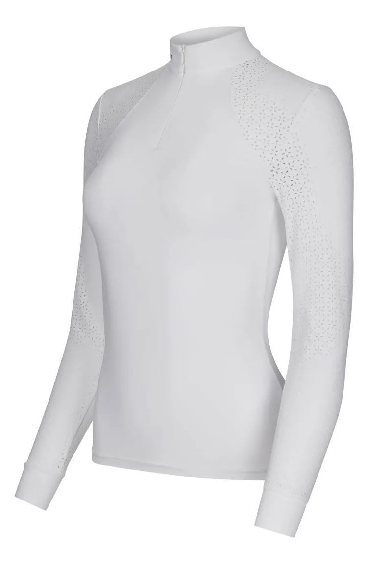 Delicate, laser-cut lace sleeve and back detail provides subtle beauty while also allowing air flow through the shirt to regulate heat and moisture.