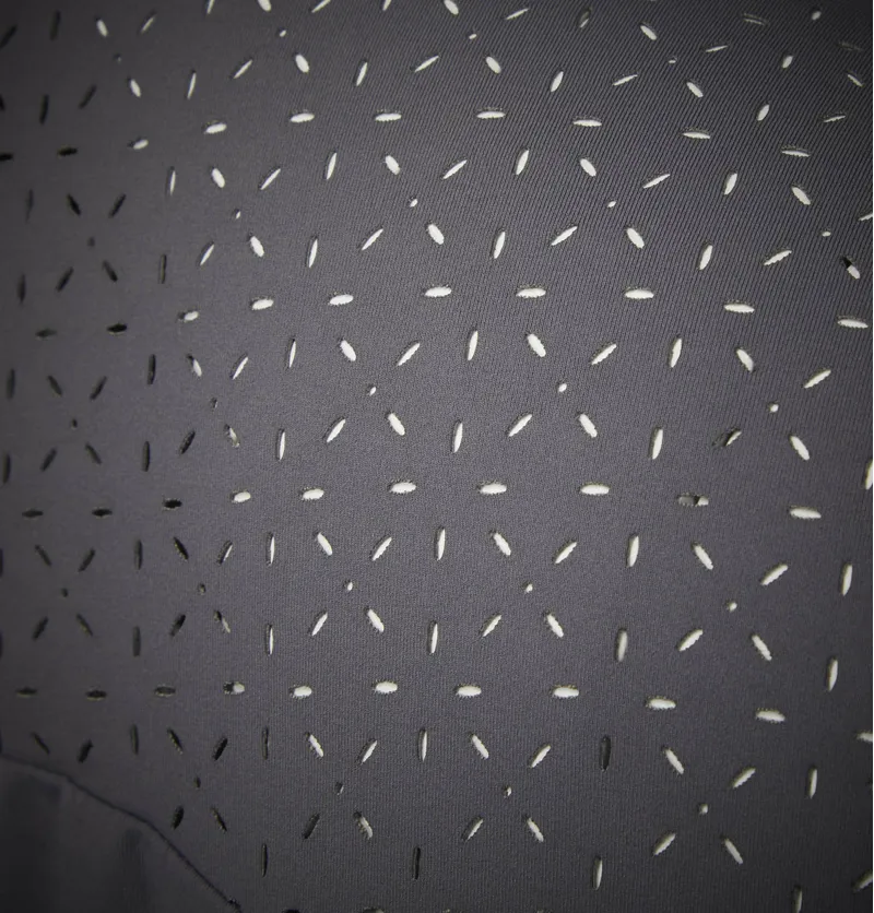 Subtle front zip closure keeps the shirt looking sleek and the delicate, laser-cut lace panels and back detail provide beautiful design while allowing air flow to regulate heat and moisture.