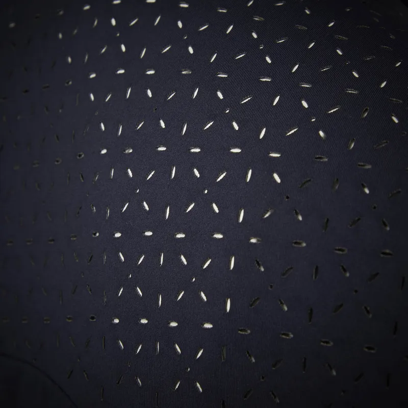 Subtle front zip closure keeps the shirt looking sleek and the delicate, laser-cut lace panels and back detail provide beautiful design while allowing air flow to regulate heat and moisture.