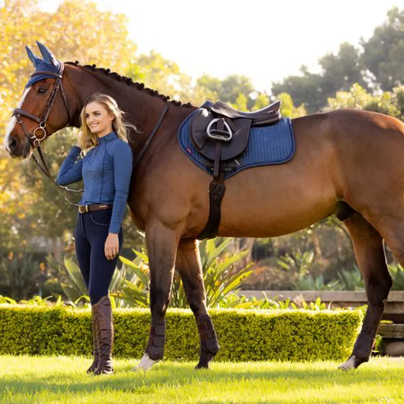 Now with a New Super Soft Suede Binding and New PU Leather Girth Protection area, the classic Close-Contact cut from LeMieux is designed to fit a wide range of more forward cut jumping saddles. Now one of the most iconic jumping pads with its high wither, elasticated D-Ring tabs and swept back profile . These saddle pads offer a very sleek and professional look to anyone’s saddle. The luxurious suede top side and new soft suede binding is complimented by super soft Bamboo lining which absorbs & controls sweat under the saddle and is beautifully comfortable and secure – minimising friction even on sensitive skinned horses. Girth keepers incorporate inner locking loops to offer more girthing options. There are several attractive colours with more new ones being added seasonally and a selection of new Small/Med pads to accommodate smaller saddles. Consider matching your Suede Close Contact pad with a Classic Fly Hood in the same colour.