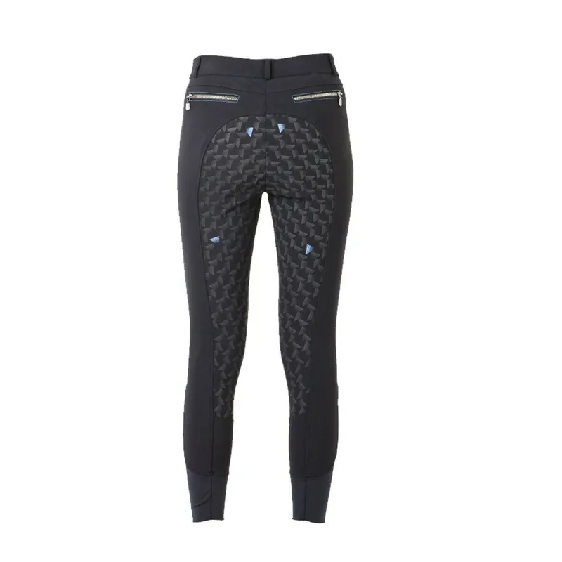They have a full silicon grip seat for extra grip making them ideal for all weather performance. With secure pockets at the front, straight silver zipped back pockets, stitched detail and silver studs help these breeches to look modern and stylish.