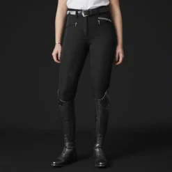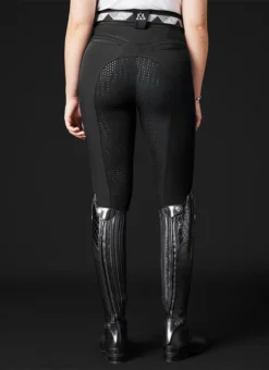 High waist breeches with fullseat silicone grip. Front pockets with Zipper closure. Flexible cuff at bottom.