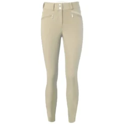 High waist breeches with fullseat silicone grip. Front pockets with Zipper closure. Flexible cuff at bottom.
