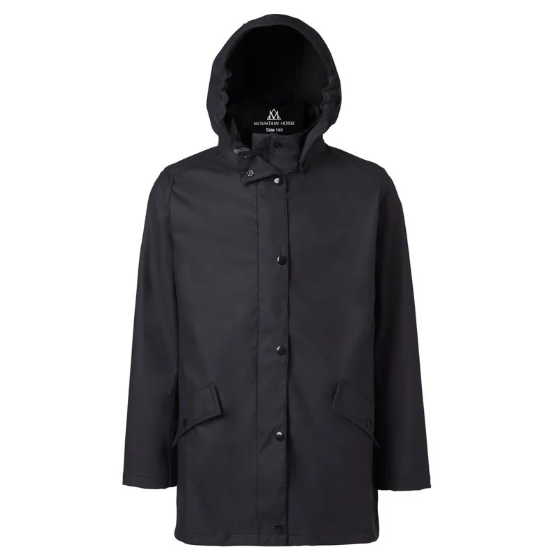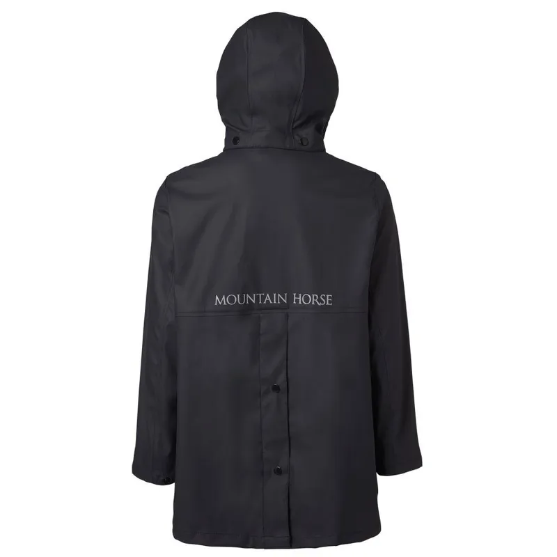 Waterproof raincoat with welded seams. Detachable hood, large front pockets. Riding slit at back and reflective details.