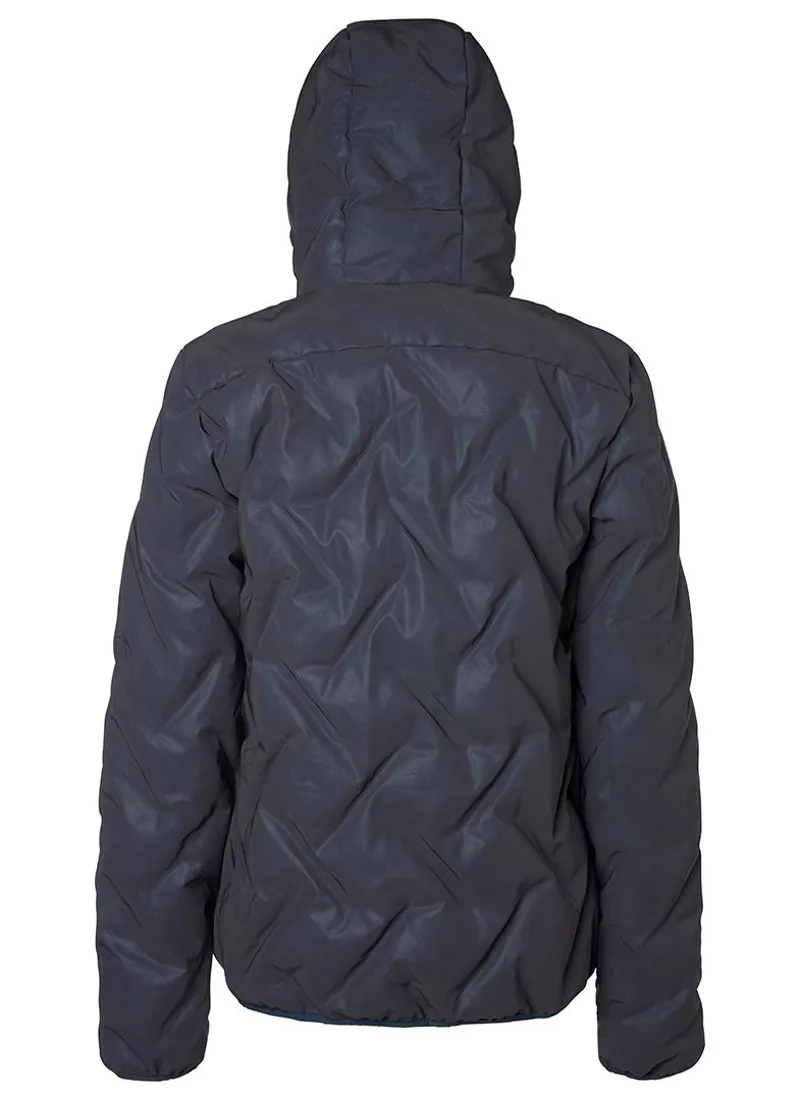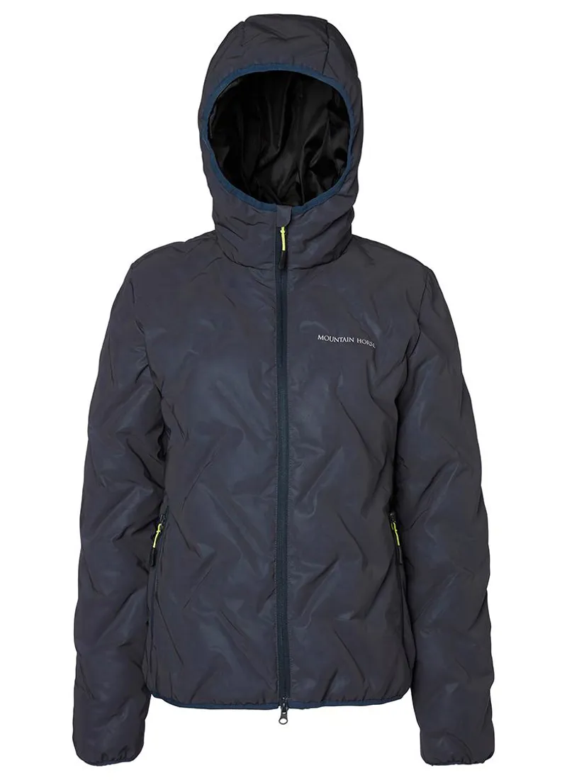 Jacket made in a reflectibe fabric and high loft light weight padding. Welded quilt pattern, protective hood and pockets with zipper closure. Underarm ventilation.