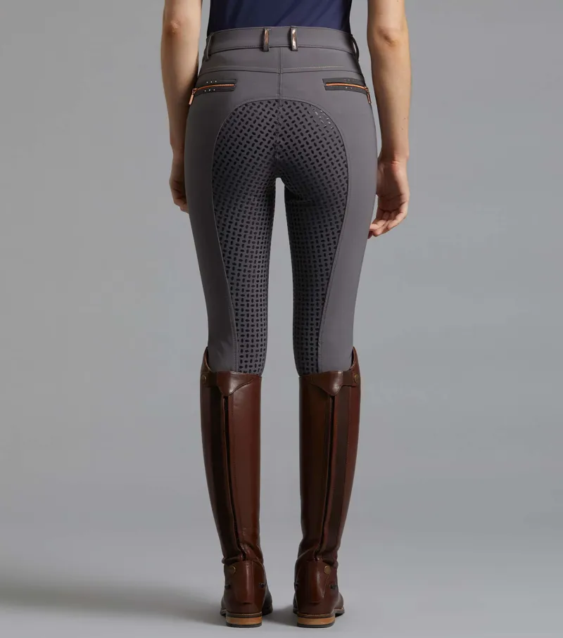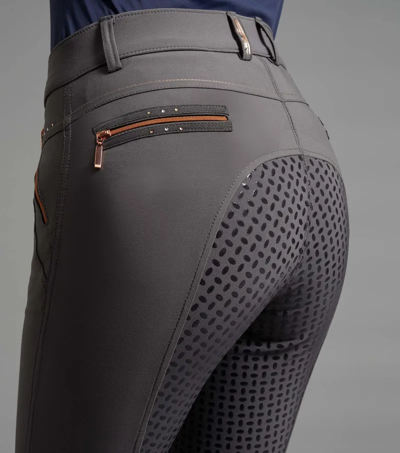 Rose gold metallic tones embellish the trims and closures of these breeches, alongside delicate crystal detailing adding a subtle sparkle. A stylish breech which delivers a balance of neat styling and functional performance. The perfect full seat gel breech for everyday riding and training.