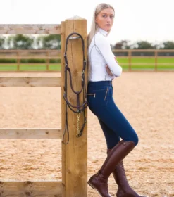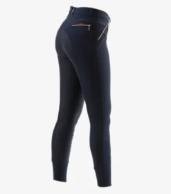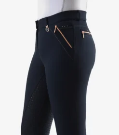 Rose gold metallic tones embellish the trims and closures of these breeches, alongside delicate crystal detailing adding a subtle sparkle. A stylish breech which delivers a balance of neat styling and functional performance. The perfect full seat gel breech for everyday riding and training.
