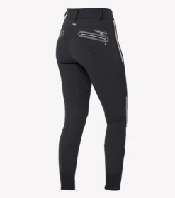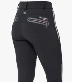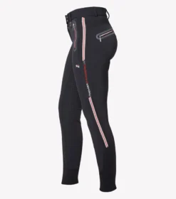 A full seat of mid weight gel has been incorporated to provide additional grip in the saddle, helping to provide a more secure seat. Offering an athletic aesthetic these ladies breeches feature strategically placed panels and seamlines to offer a sculpting look and fit, with sporty striped grosgrain tape.