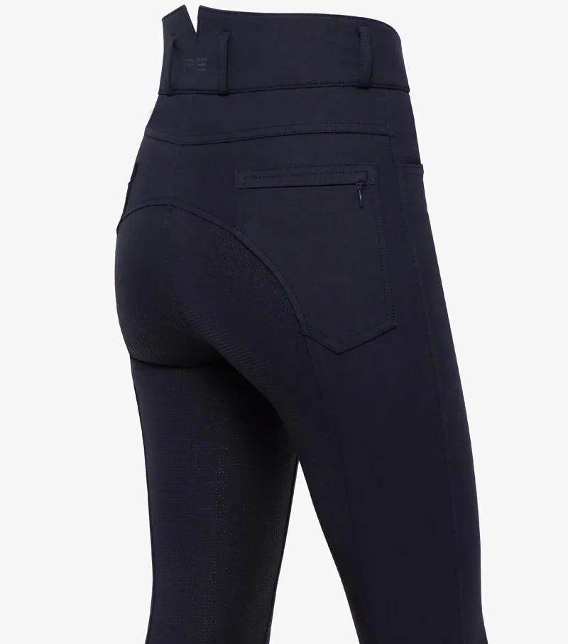 A technical gel full seat has been incorporated – helping to provide additional security in the saddle. The slightly wider waistband with elegant ‘v’ cut design at the rear provides a flattering fit and finished with a classy double-stud detail.