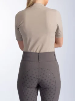 Short sleeve top made in a technical and soft polyamide blend that transports moisture and gives a cool feeling to the skin. Slightly longer sleeves than a usual short-sleeve for comfort and adds a stylish feeling to the look. The mock-neck and matching cuffs and hem are classic yet stylish details, just like the logo prints at chest and back neck. The ultimate top for every equestrian that wants to be comfortable but not miss out on any technical functions.