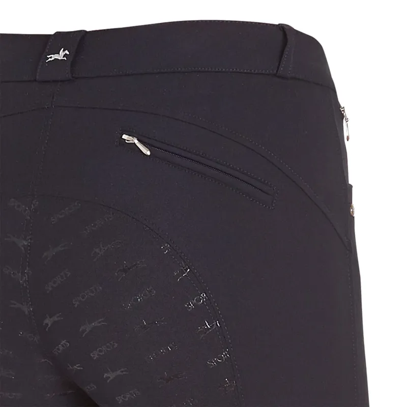 The durable ladies breeches Cindy FS/ Loretta KG by Schockemöhle Sports are areliable companion in the saddle. They are suitable for daily training,but also cut a fine figure at horse shows. The silicone full seat / kneegrip provides a safe feeling on horseback, in addition, the high-qualitymaterial is breathable. But these breeches do not only score with theirfunctional features, but can also convince with their sporty-elegant look.Real eyecatchers are the logo embroidery on the back belt loop, logorivets on the pockets and the curved yoke seam, which appears especiallyflattering at the same time. Even more wearing comfort is guaranteed bythe elastic cuffs at the hem.