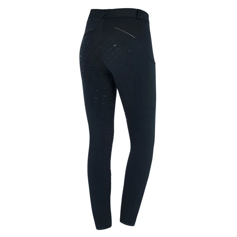Comfortable riding leggings inside brushed | full seat silicon print | logo silicon print at the left leg | dividing seams with deco stitching | welt pocket with glitter piping in the back